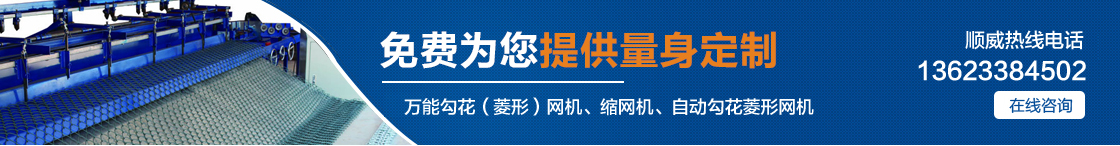 | 安平縣順威絲網(wǎng)機械設備制造有限公司自產(chǎn)自銷,省去中間環(huán)節(jié),讓利給客戶,真正的讓您省錢。主要產(chǎn)品有:萬能勾花(菱形)網(wǎng)機、縮網(wǎng)機、自動勾花菱形網(wǎng)機、全自動勾花菱形網(wǎng)機。 |